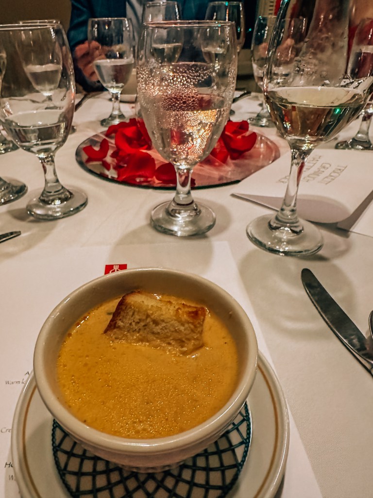 A creamy shrimp bisque with shallot, cognac, and a truffle oil brioche crouton, it was significantly lighter than similar bisques I’ve sampled – but pleasantly so. Our table was obsessed with the large crouton, and it had a touch of cornmeal taste, which I found delightful. To accompany this course, we enjoyed a 2020 El Enemigo Argentine Chardonnay. Its unique character revealed itself primarily on the finish, leaving me curious to explore more Argentine whites.