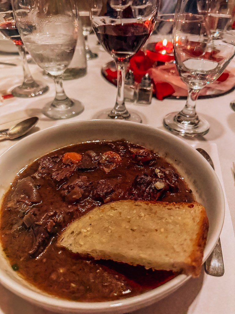 I found myself sitting in front of a generous portion of exceptionally tender Wagyu Beef Bourguignon which was slow braised in French wine. Sides were a hefty & savory Potato Gruyère gratinée in a prosciutto “oven,” accompanied by earthy maple & cinnamon roasted butternut squash (neither pictured). The sides paired particularly well with the wine chosen for this course: a 2020 Domaine Fagolet Morgon Le Janin (an excellent French Gamay). The body of this wine was comparatively light while the flavors/nose were robust. I searched online for bottles of this wine the following day.
