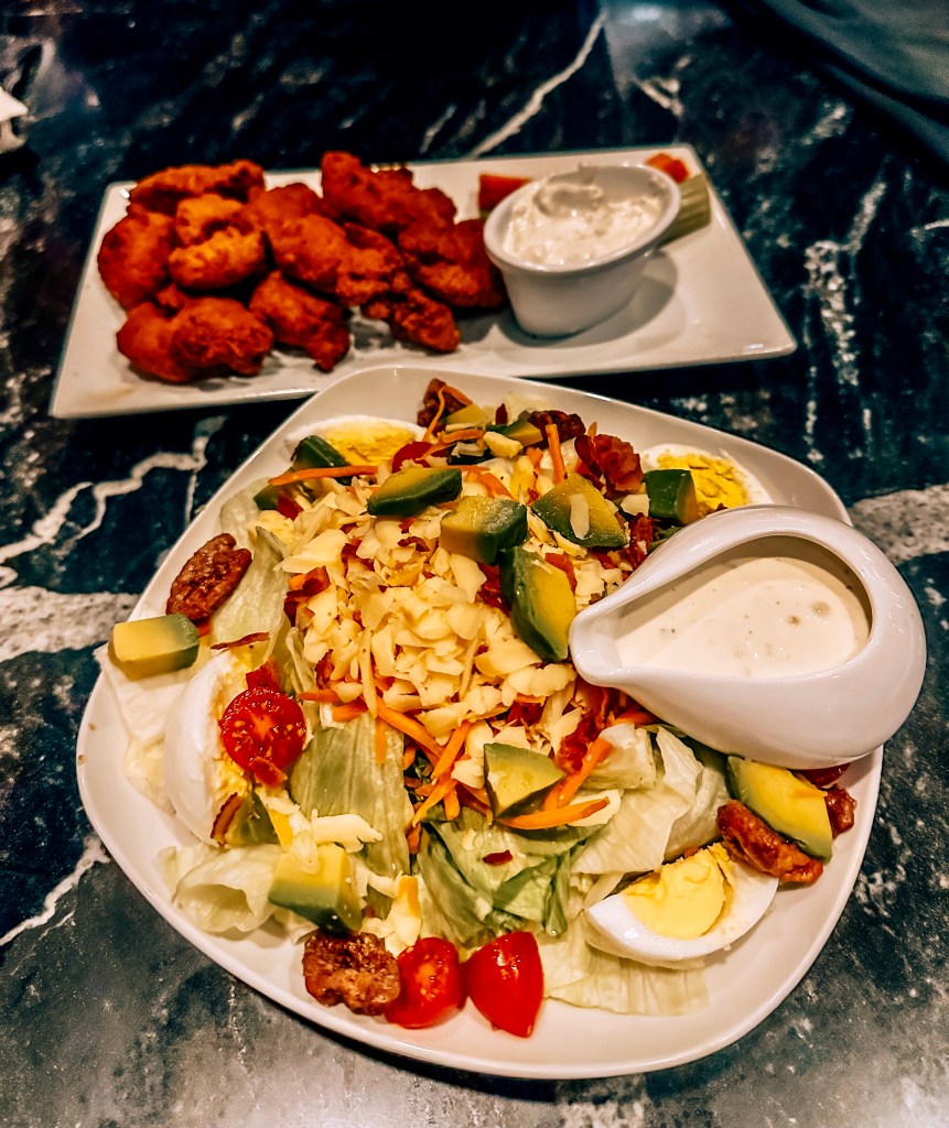 As a diner who rarely repeats dishes, the “Pork Wontonchos” ($15) are an exception. Despite my limited pork experience/preference due to a kosher dietary upbringing, these wontons loaded with pulled pork, BBQ sauce, slaw, red onion, sour cream, and Caso Fresco are irresistible. The balance of texture, temperature, and flavor is unparalleled in bar food. I recommend pairing it with a Riesling, sparkling Rosé, or Zinfandel, based on your wine preference. Plus, one order can easily satisfy two, especially with side salads and dessert.