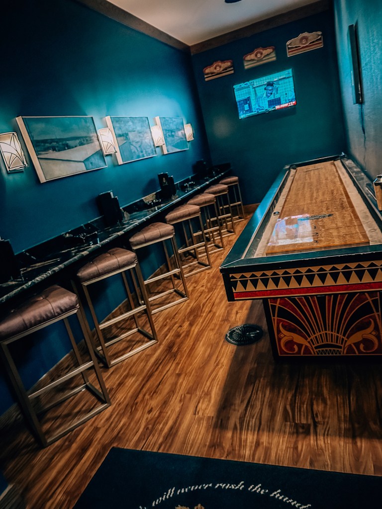 Walking into the venue, you’re greeted by luxe leathers, hardwood floors, black & white marble-topped tables, and rich yet muted wallpapers & wall coverings. Always immaculately clean, I especially appreciate the luxurious bar and the small but richly appointed restrooms. There is a relaxed refinement in the air (particularly if one goes earlier in the evening during Happy Hour, or at the beginning of the live music for the evening). Sports fans can enjoy the large screen at the back, while a stylish shuffleboard area, complete with a smaller screen, caters to more interactive entertainment.